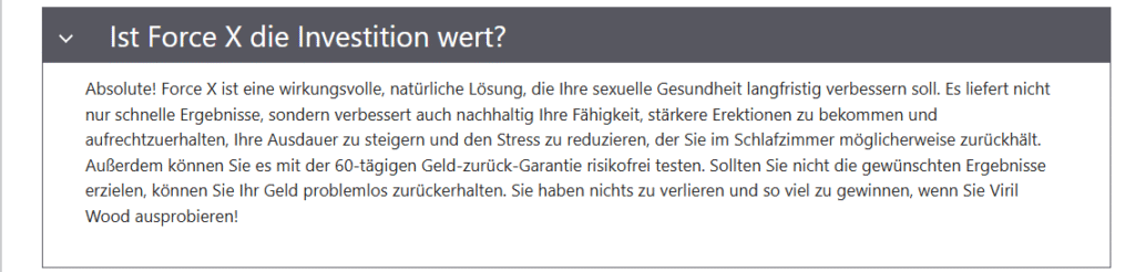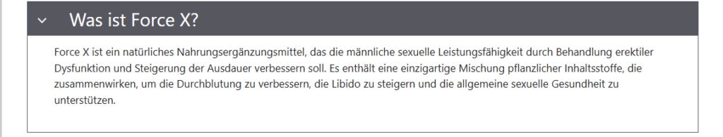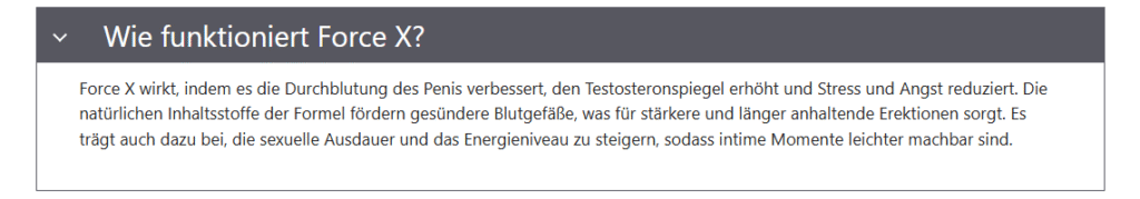 Tausende von Menschen haben mit Force X Tabletten ihre sexuelle Leistungsfähigkeit erfolgreich verbessert, indem sie ihre erektile Dysfunktion überwunden und ihre Ausdauer gesteigert haben.