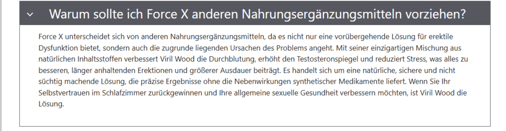 Normalerweise schreibe ich keine Rezensionen, aber Force X Tabletten hat eine verdient. Ich hatte gelegentlich Probleme im Schlafzimmer und suchte nach einer natürlichen Lösung. Nach einigen Tagen fühlte ich mich energiegeladener und bemerkte eine spürbare Verbesserung meiner Erektionen.